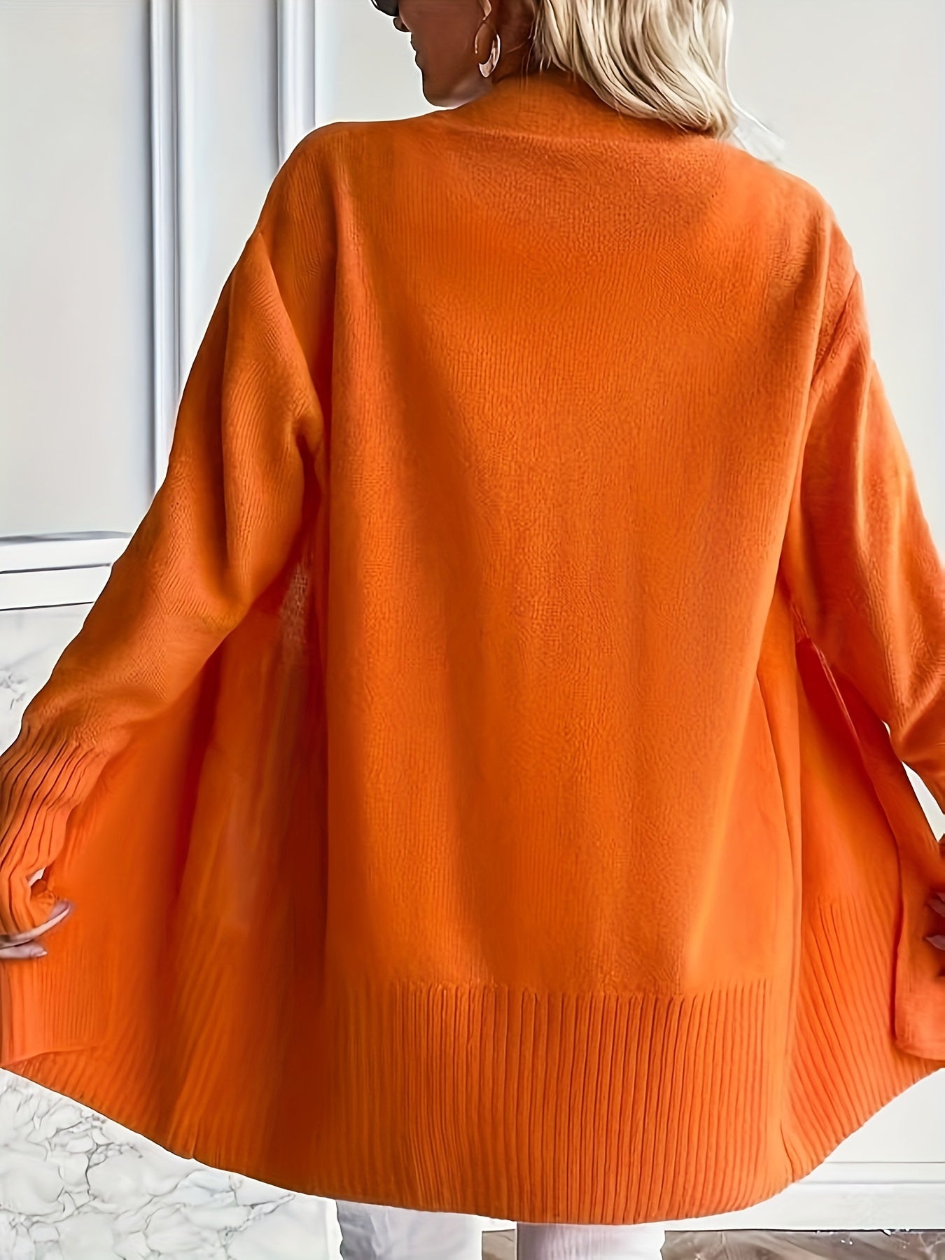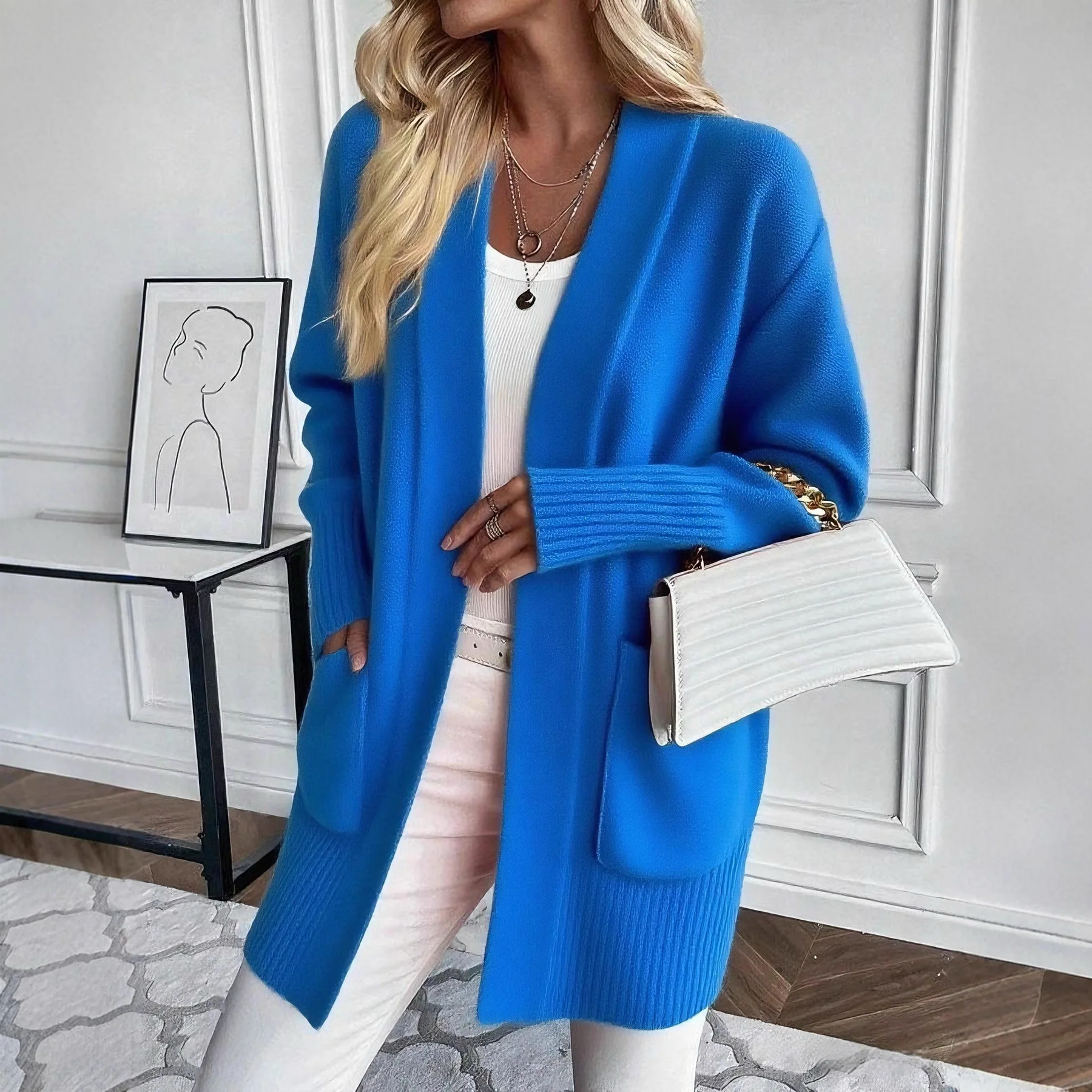 The Elara Cozy Open Front Cardigan blends comfort and style, making it a versatile essential for any wardrobe. Its open-front design allows effortless layering over blouses, tops, or dresses, creating a modern and relaxed look. The loose, flowing fit flatters every silhouette, while ribbed cuffs and hem add subtle structure and a refined finish. Crafted from soft, comfortable fabric, this cardigan offers a pleasant feel throughout the day and is perfect for everyday wear as well as relaxed evenings.