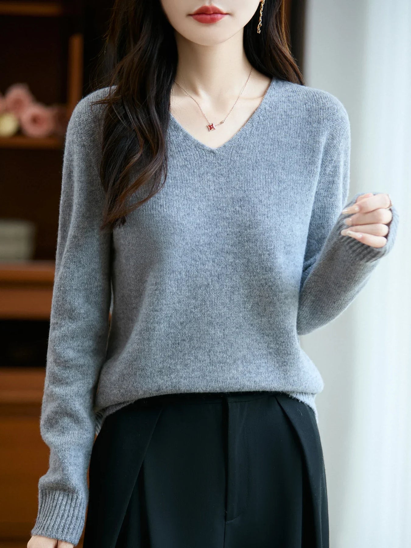 The Mila Fine Knit Sweater blends timeless elegance with luxurious comfort, making it an essential piece for every wardrobe. Its feminine V-neckline subtly highlights the décolleté, adding a refined touch to its minimalist silhouette. Crafted from a premium cashmere blend with wool, this sweater offers a soft, smooth feel against the skin while ensuring lasting warmth and breathability. Ribbed edges at the cuffs and hem provide a comfortable, shape-retaining fit—perfect for everyday wear, office looks, or relaxed moments at home.
