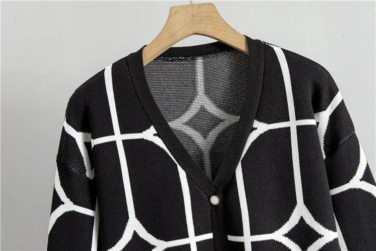 Modern statement: Geometric pattern on the cardigan adds a stylish, contemporary touch to any outfit.