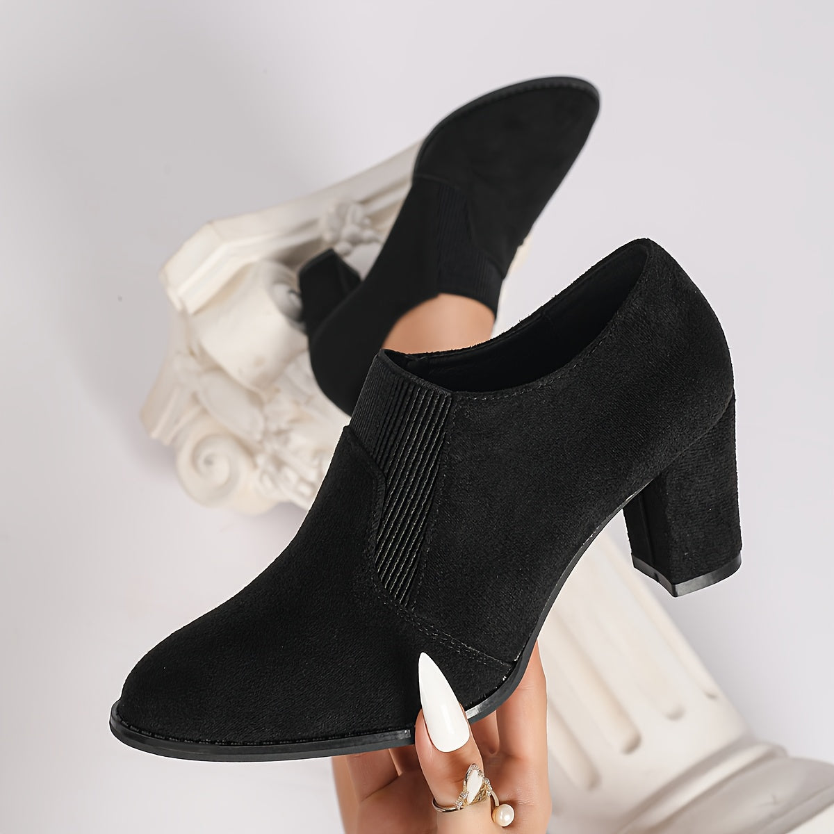 The Bella ankle boots are designed to combine feminine elegance with everyday comfort and a refined modern look. Crafted from high-quality suede-look material, they feature a smooth and luxurious appearance enhanced by a rich emerald tone. The elastic knit side panel ensures a flexible fit around the ankle, while the structured block heel provides stability and support for all-day wear. Their versatile design makes them a stylish choice for office wear, city outings, or casual gatherings.